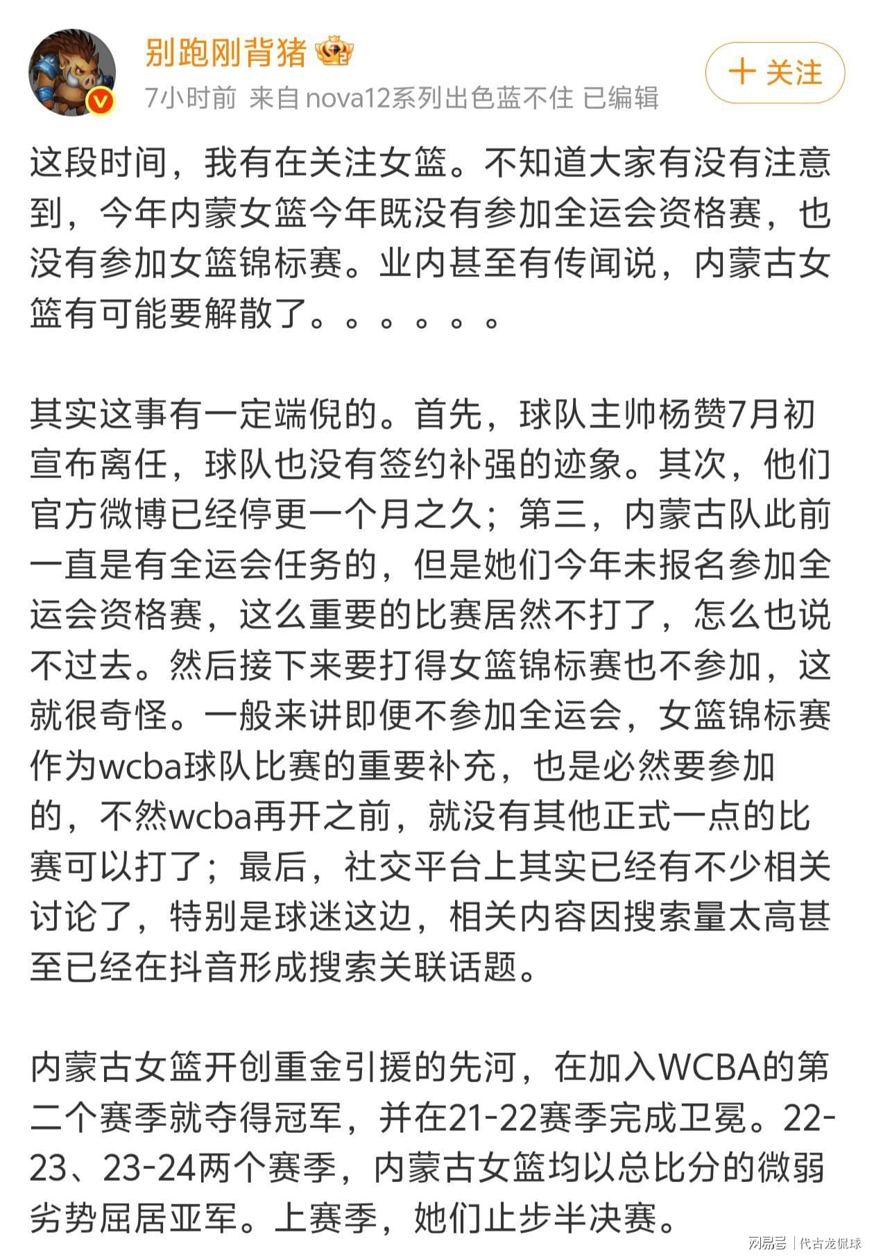 来自媒体人别跑刚背猪的最新报道,各种迹象似乎都在暗示,wcba的豪门球队内蒙古女篮正面临着前所未有的危机,多个迹象显示,这支女篮俱乐部有解散的可能。
