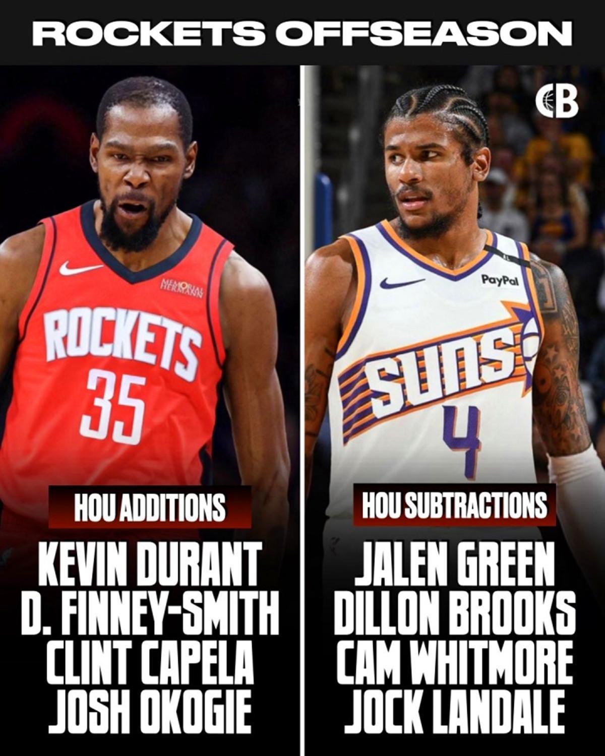 杜兰特:8换1低价得到,依旧是顶级的关键球得分手,针对性补强火箭队短板,同时价码足够低,又与主帅乌度卡、小贾等年轻球员私交甚好;