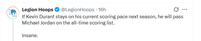 雷速体育7月4日讯 据美媒Legion Hoops报道,如果杜兰特保持现在的得分节奏,他的NBA历史常规赛总得分将在下赛季超越乔丹。